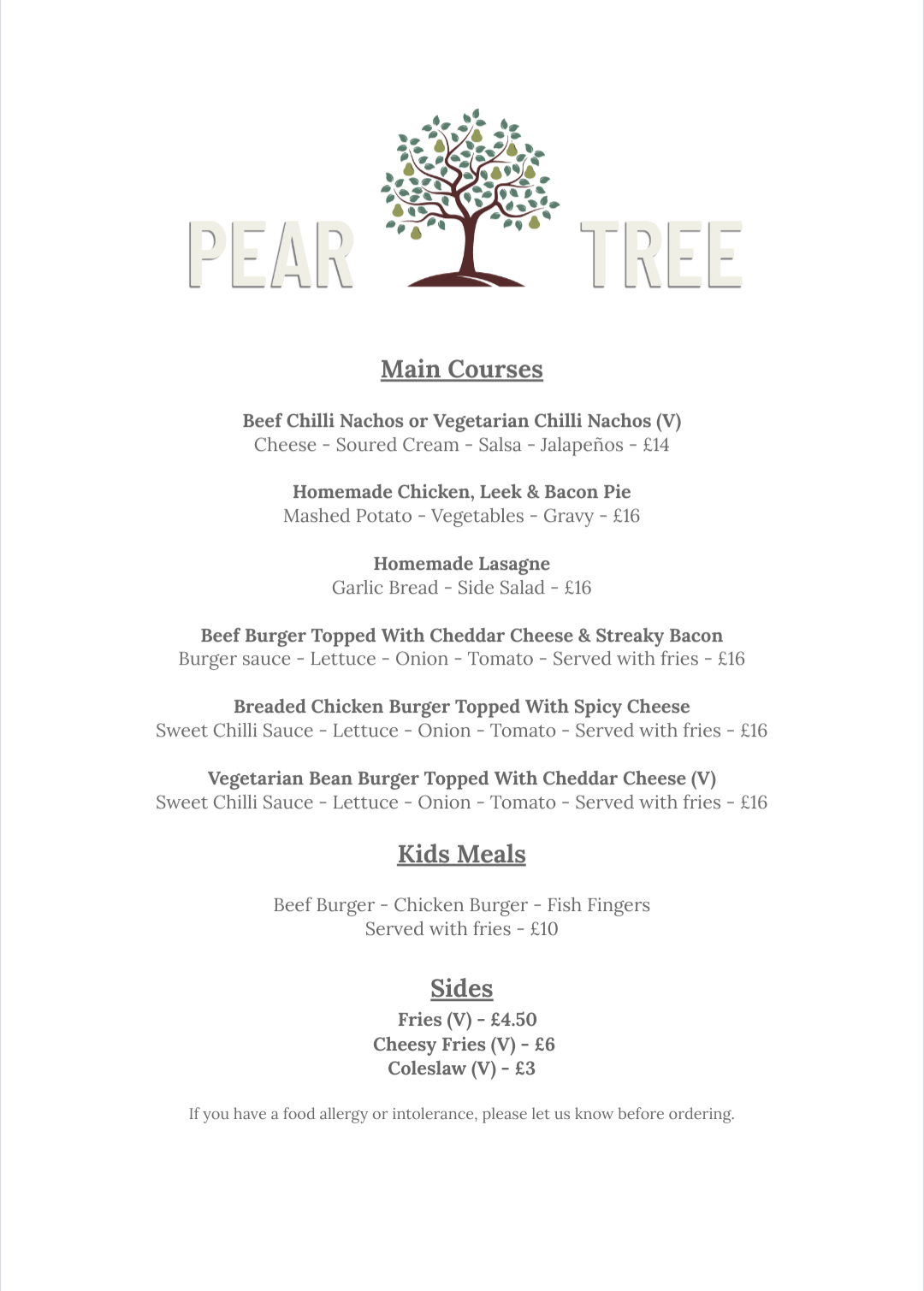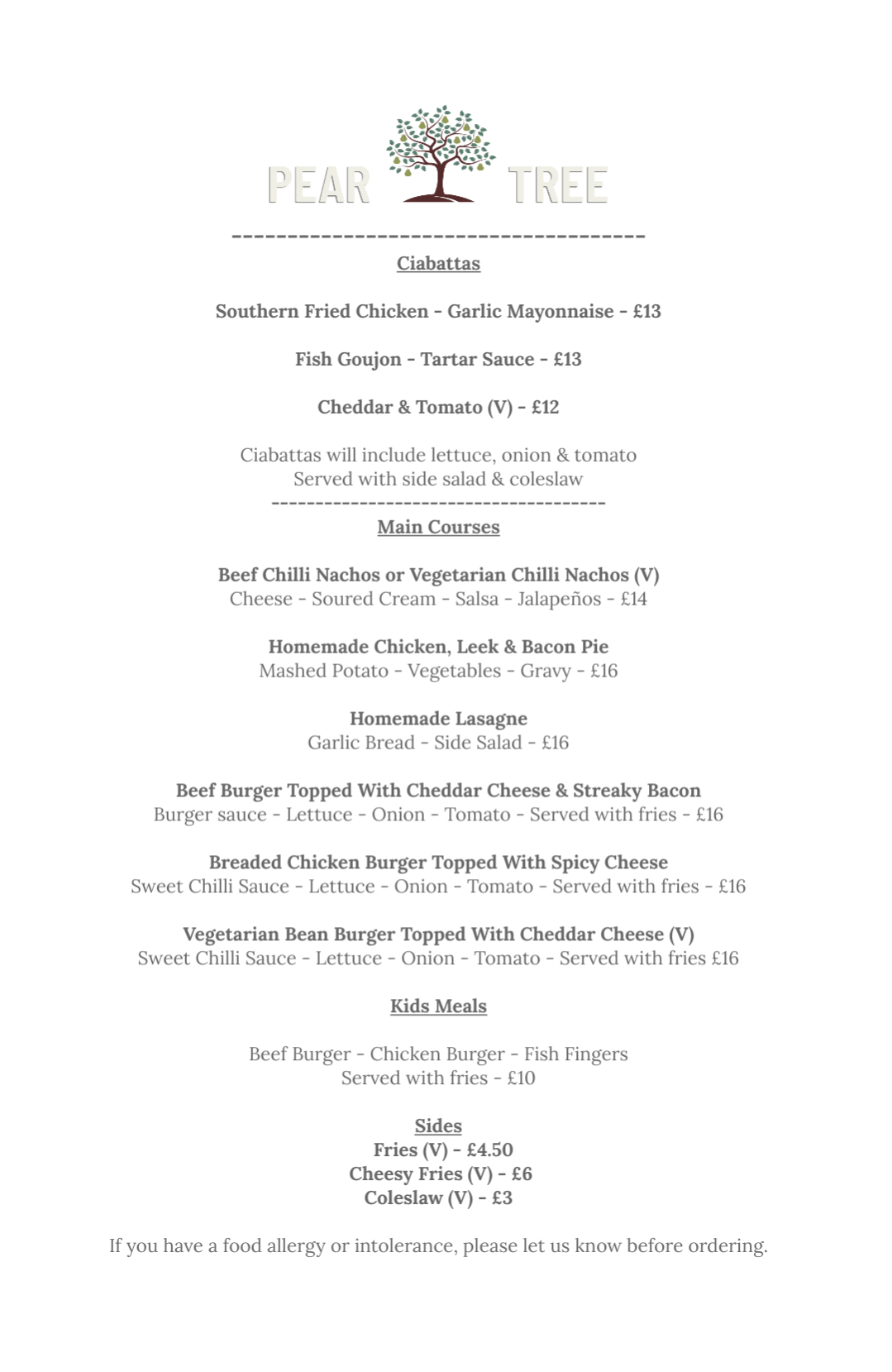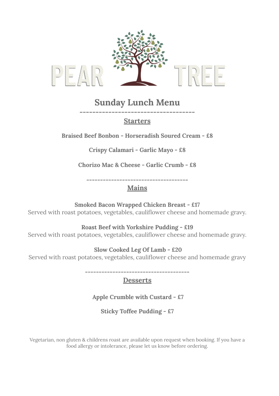 In the winter seasons on Sundays, you can enjoy our most talked about Sunday Roast. A choice of Lamb, beef or pork is usually available, served with all the traditional trimmings and lashings of delicious gravy. Sample Menu available below.